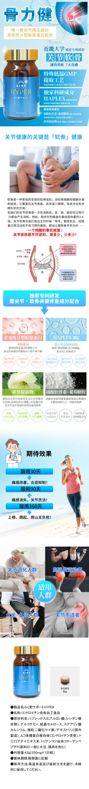 Top 全部商品 骨力健 逆转关节老化,坐·立·行烦恼全解决 骨力健 非变性Ⅱ型胶原蛋白配合软骨再生关节炎症抑制关节营养补充●商品名:骨力健●原材料名:Haplex(透明质酸、卵磷脂复合物)、氨基葡萄糖、结晶纤维素、硬脂酸钙、微粒二氧化硅/ 糊精(国内制造)、黏多糖蛋白复合物(含软骨素)、杜仲提取物粉末、鸡胸软骨来源的胶原蛋白肽(原料部分含大豆、鸡肉成分)●内容量:42g(350mg × 120粒)●保质期:记载于盒侧面●保存方法:避免高温多湿及直射阳光,请存放于阴凉处。 商品价格: ¥1980.00