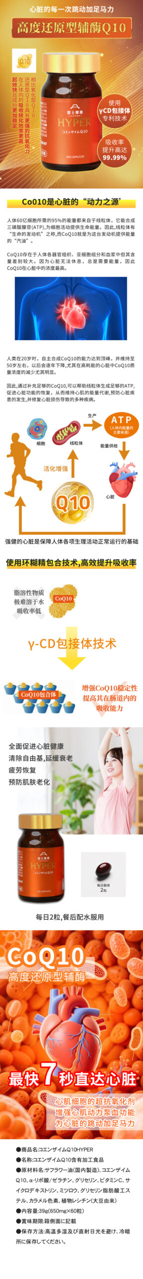Top 全部商品 5-ALA 强化心脏机能 CoQ10 活化细胞线粒体的主要成分之一为心肌细胞提供能量增强心肌动力和泵血功能为心脏的每一次跳动加足马力●商品名:高度还原型辅酶Q10 HYPER●原材料名:红花油(国内制造)、辅酶Q10、α-硫辛酸/ 明胶、甘油、维生素C、环状糊精、蜂蜡、甘油脂肪酸酯、焦糖色素、植物卵磷脂(大豆来源)●内容量:39g(650mg × 60粒)●保质期:记载于盒侧面●保存方法:避免高温多湿及直射阳光,请存放于阴凉处。 商品价格: ¥1980.00