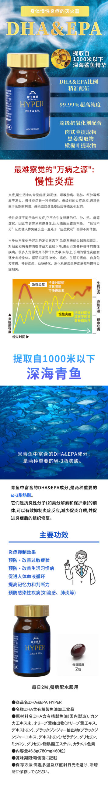 Top 全部商品 DHA&EPA 身体慢性炎症的清道夫 DHA&EPA 成分提取自1000米以下深海青鱼改善细胞膜脂质结构增强不饱和脂肪酸抑制身体各种慢性炎症●商品名:DHA&EPA HYPER●原材料名:含DHA的精制鱼油(国内制造)、姜黄提取物粉末、橄榄叶提取物(橄榄叶提取物、糊精)、黑姜提取物(黑姜提取物、糊精)/ 明胶、甘油、蜂蜡、甘油脂肪酸酯、焦糖色素●内容量:46.8g(780mg × 60粒)●保质期:记载于盒侧面●保存方法:避免高温多湿及直射阳光,请存放于阴凉处。 商品价格: ¥1980.00